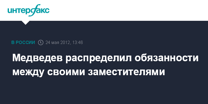 Москва. 24 мая. INTERFAX.RU - Премьер-министр РФ Дмитрий Медведев подписал распоряжение о распределении обязанностей между своими заместителями.
