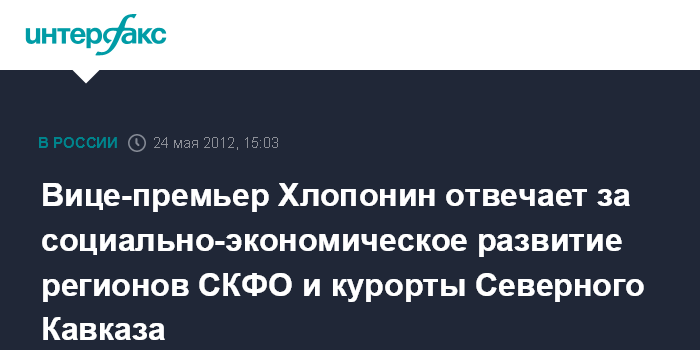 Москва. 24 мая. INTERFAX.RU - Вице-премьер - полпред президента РФ в Северокавказском федеральном округе Александр Хлопонин в соответствии с распределением обязанностей в правительстве координирует работу в области комплексного социально-экономического развития субъектов РФ, входящих в состав СКФО.