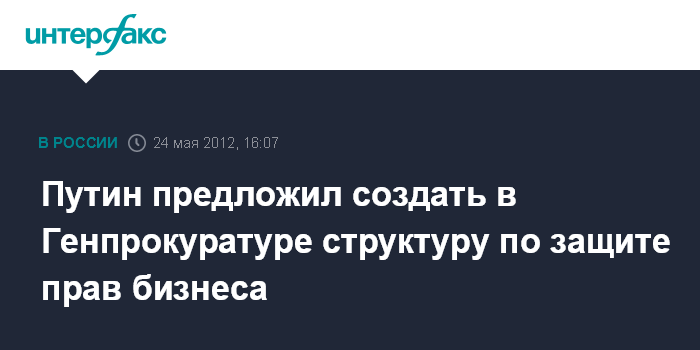 Ново-Огарево. 24 мая. INTERFAX.RU - В Генпрокуратуре может быть создана структура, занимающаяся вопросами защиты прав предпринимателей, заявил президент РФ Владимир Путин на встрече с представителями общественных организаций деловых кругов.