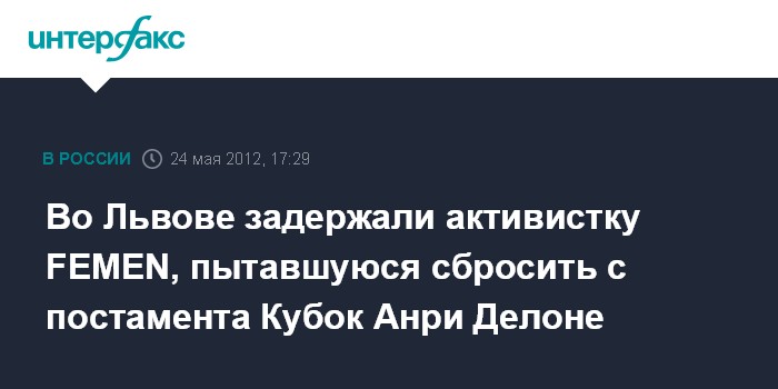 Львов. 24 мая. INTERFAX.RU - Львовская милиция задержала активистку движения FEMEN, пытавшуюся в четверг свалить с постамента Кубок Анри Делоне.