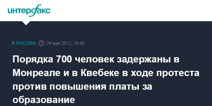 Оттава. 24 мая. INTERFAX.RU - В ходе университетских протестов в Монреале и в Квебеке против повышения властями платы за образование задержано около 700 участников демонстраций, сообщили в четверг канадские СМИ.