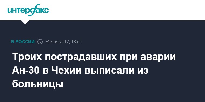 Москва. 24 мая. INTERFAX.RU - Трое российских военнослужащих, пострадавших во время аварии самолета Ан-30б в Чехии, выписаны из больницы, сообщает Минобороны РФ.