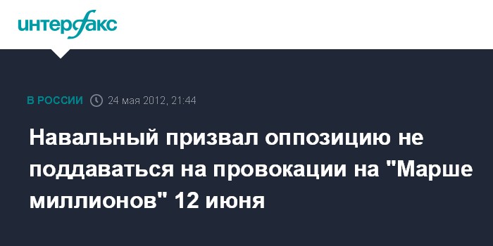 Москва. 24 мая. INTERFAX.RU - Оппозиционер Алексей Навальный не исключает провокаций на очередном "Марше миллионов" 12 июня и советует на них не поддаваться. "Организация провокаций - это один из инструментов работы власти и статей бюджета. Поэтому будут провокации. Мы должны быть к этому готовы, и на эти провокации не поддаваться", - заявил Навальный, выступая перед оппозиционерами на Старом Арбате.