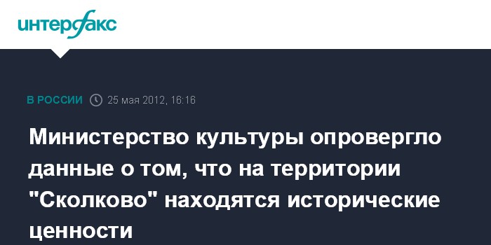 Москва. 25 мая. INTERFAX.RU - Министерство культуры опровергло информацию СМИ о конфликте с научным центром "Сколково" из-за предположительного нахождения на территории наукограда фрагментов фундамента дворца Александра Меншикова 18-го века.