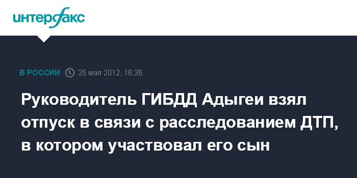 Москва. 25 мая. INTERFAX.RU - Начальник управления ГИБДД по Адыгее Алий Чиназиров уходит во внеочередной отпуск, чтобы избежать обвинений в возможном влиянии на ход расследования ДТП с участием его сына.