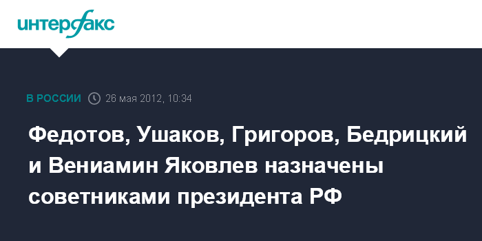 Федотов, Ушаков, Григоров, Бедрицкий и Вениамин Яковлев назначены советниками президента РФ