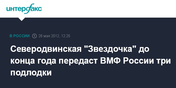 Северодвинск. 26 мая. INTERFAX.RU - ОАО "Центр судоремонта "Звездочка" до конца года передаст ВМФ России три подводные лодки, проходившие ремонт и модернизацию на верфях завода, сообщил "Интерфаксу" в субботу генеральный директор "Звездочки" Владимир Никитин. "В этом году у нас насыщенная сдаточная кампания. До конца года военно-морскому флоту будут переданы две атомные подводные лодки "Верхотурье" и "Новомосковск", а также большая дизель-электрическая подводная лодка (ДЭПЛ) "Калуга", - сказал В.Никитин.
