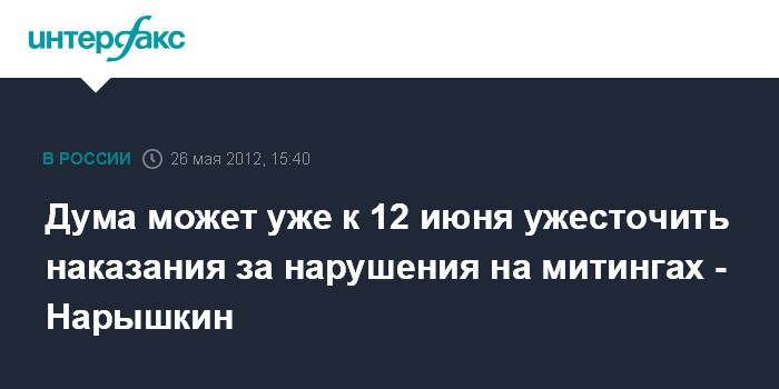 Москва. 26 мая. INTERFAX.RU - Спикер Госдумы Сергей Нарышкин считает реальным принятие к 12 июня резонансного законопроекта, усиливающего ответственность за нарушение правил проведения митингов. "Принципиально - реально, но дискуссии покажут", - заявил С.Нарышкин "Интерфаксу", отвечая на вопрос, возможно ли принятие поправок к 12 июня.