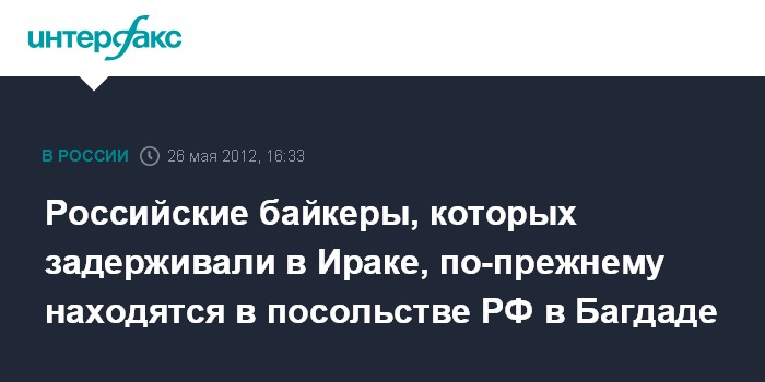 Москва. 26 мая. INTERFAX.RU - Российские байкеры, которые ранее были задержаны в Ираке и затем освобождены, пока не могут вернуться в Россию, потому что в Ираке выходные дни и им не могут оформить визы, необходимые для выезда. "Российские мотобайкеры по-прежнему находятся в посольстве РФ в Багдаде. С учетом того, что никто из них не имеет действующей иракской визы, а пятница и суббота - это официальные выходные дни в Ираке, срочная отправка наших граждан на Родину сегодня физически невозможна", - сообщили "Интерфаксу" в департаменте информации и печати МИД РФ.
