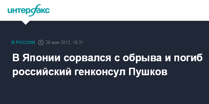 Москва/Токио. 26 мая. INTERFAX.RU - В субботу в пригороде японского города Ниигата погиб генеральный консул России Владимир Пушков, сообщила "Интерфаксу" по телефону пресс-атташе посольства РФ в Японии Татьяна Горохова.