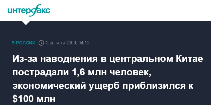 Пекин. 3 августа. ИНТЕРФАКС-КИТАЙ - Экономический ущерб от наводнения, вызванного проливными дождями в центральной китайской провинции Аньхуэй, согласно предварительным подсчетам, оценивается в 605 млн юаней ($89 млн). Однако реально он может превысить данную цифру, сообщили в воскресенье местные СМИ.
