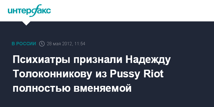 Москва. 28 мая. ИНТЕРФАКС - Участница панк-группы Pussy Riot Надежда Толоконникова, арестованная после участия в скандальной акции в храме Христа спасителя, признана вменяемой.