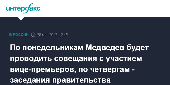 Горки. 28 мая. INTERFAX.RU - Премьер-министр РФ Дмитрий Медведев сообщил, что намерен ежедневно по понедельникам проводить совещания с участием всех вице-премьеров, а по четвергам - заседания правительства.