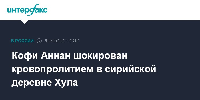 Каир. 28 мая. INTERFAX.RU - Спецпосланник ООН и ЛАГ Кофи Аннан в понедельник заявил журналистам, что шокирован событиями в сирийской деревне Хула, где в пятницу погибли не менее 116 человек.