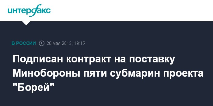 Москва. 28 мая. INTERFAX.RU - "Объединенная судостроительная корпорация" (ОСК) и Минобороны РФ подписали в понедельник контракт на поставку ВМФ России пяти атомных подводных ракетоносцев проекта "Борей", сообщил "Интерфаксу" официальный представитель ОСК Алексей Кравченко.