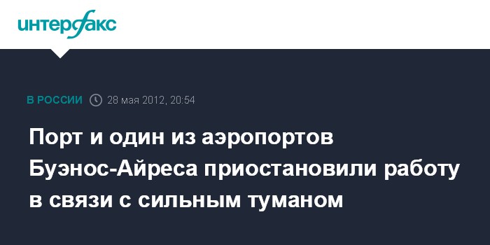 Буэнос-Айрес. 28 мая. INTERFAX.RU - Аэропорт Буэнос-Айреса, обслуживающий внутренние рейсы, и порт аргентинской столицы приостановили работу на несколько часов в связи с сильным туманом, сообщило в понедельник агентство ЭФЭ. Аэропорт приостановил все виды операций, однако, по словам его представителей, планирует вскоре возобновить работу, передает ЭФЭ.
