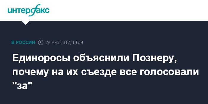 Москва. 29 мая. INTERFAX.RU - В руководстве "Единой России" удивлены реакцией телеведущего Владимира Познера, который в своей авторской программе в ночь на вторник критически высказался по поводу единогласного голосования на съезде "Единой России" при утверждении кандидатуры премьера Дмитрия Медведева на пост лидера партии.