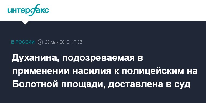 Москва. 29 мая. INTERFAX.RU - 18-летняя Александра Духанина, которой должны во вторник избрать меру пресечения в рамках уголовного дела по беспорядкам на Болотной площади 6 мая, доставлена в Басманный суд Москвы, сообщила журналистам пресс-секретарь суда Екатерина Коротва.