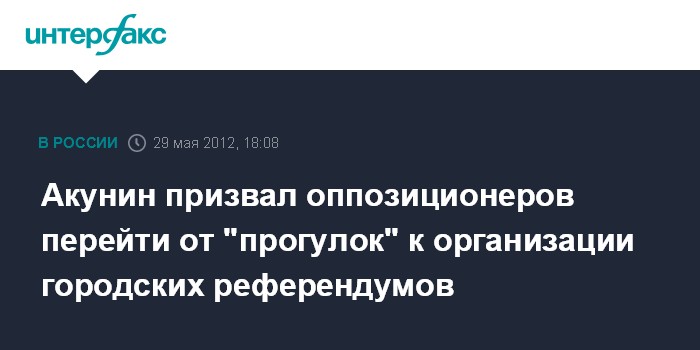 Москва. 29 мая. INTERFAX.RU - Писатель Борис Акунин предлагает участникам протестного движения перейти от эмоций к практическим действиям и серьезно обсудить идею повсеместного проведения городских референдумов.