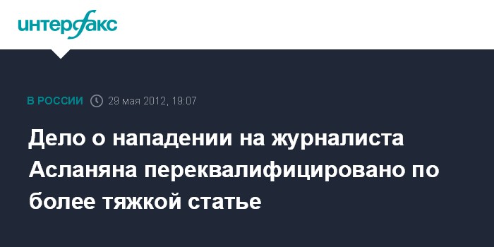 Москва. 29 мая. INTERFAX.RU - Следствие переквалифицировало уголовное дело, возбужденное по факту нападения на журналиста Сергея Асланяна, сообщили журналистам в пресс-службе ГУ МВД России по Москве.