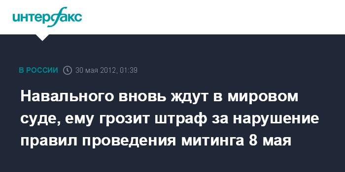 Москва. 30 мая. ИНТЕРФАКС - Мировой участок Тверского суда Москвы рассмотрит очередное административное дело против блогера Алексея Навального о нарушении порядка проведения массовых мероприятий за акцию 8 мая в центре Москвы.