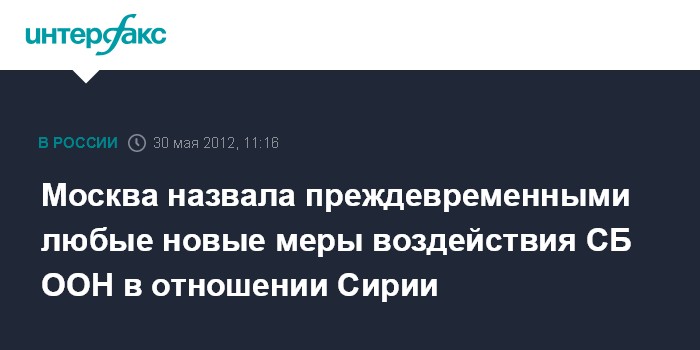 Москва. 30 мая. INTERFAX.RU - Россия выступает против созыва нового заседания СБ ООН по Сирии в ближайшее время и каких-либо других мер воздействия со стороны Совета Безопасности на ситуацию в этой стране.