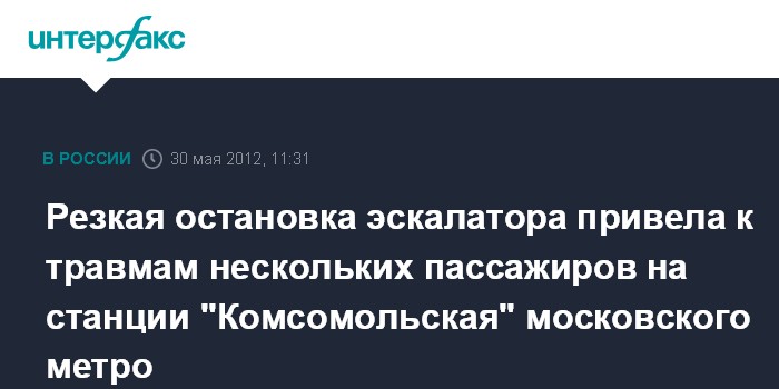 Москва. 30 мая. INTERFAX.RU - Несколько человек упали и получили легкие ушибы после резкой остановки одного из эскалаторов на станции метро "Комсомольская" (Кольцевая), передает корреспондент "Интерфакса".