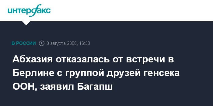 Сухуми. 3 августа. INTERFAX.RU - Абхазия отказывается от участия во встрече с группой друзей Генерального Секретаря ООН в Берлине в связи с событиями в Южной Осетии, заявил абхазский президент Сергей Багапш на заседании Совета безопасности республики в воскресенье.