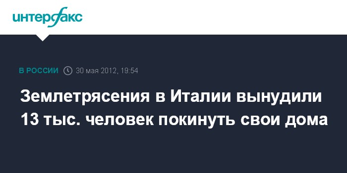 Рим. 30 мая. INTERFAX.RU - Примерно 13 тыс. человек в настоящее время остаются без крова после произошедших во вторник землетрясений в итальянской области Эмилия-Романья, сообщают в среду в местной службе спасения.