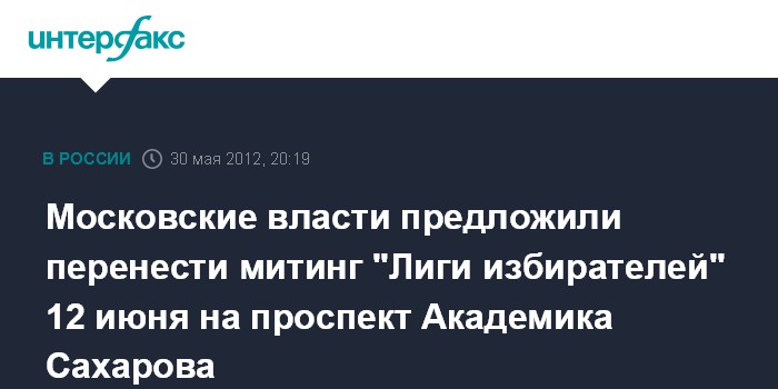 Московские власти предложили перенести митинг "Лиги избирателей" 12 июня на проспект Академика Сахарова