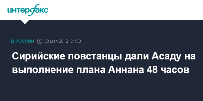 Дубай. 30 мая. INTERFAX.RU - Сирийские мятежники предъявили ультиматум президенту Башару Асаду, дав ему 48 часов на выполнение плана по урегулированию ситуации в стране, сообщает в пятницу межарабский телеканал "Аль-Арабийя".