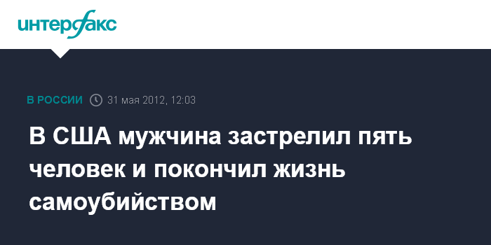 Вашингтон. 31 мая. INTERFAX.RU - В городе Сиэтл на северо-западе США вооруженный мужчина застрелил пятерых местных жителей, а после пустил пулю себе в голову, сообщает местная газета The Seattle Times.