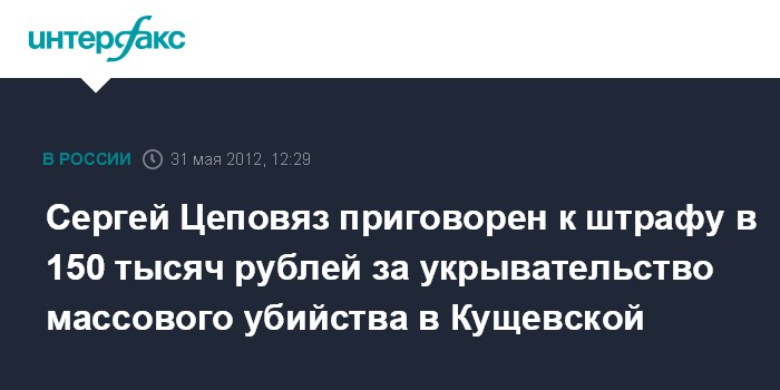 Краснодар. 31 мая. INTERFAX.RU - Кущевский районный суд Краснодарского края в четверг вынес решение о штрафе Сергею Цеповязу, обвиняемому в укрывательстве убийства 12 человек в доме фермера.