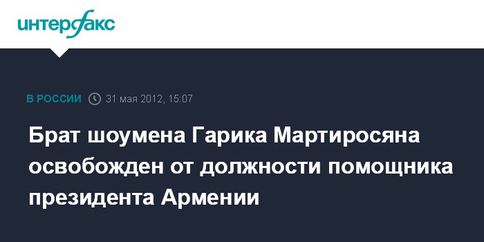 Ереван. 31 мая. INTERFAX.RU - Президент Армении Серж Саргсян освободил с должности своего помощника Левона Мартиросяна, который является братом известного российского шоумена Гарика Мартиросяна.
