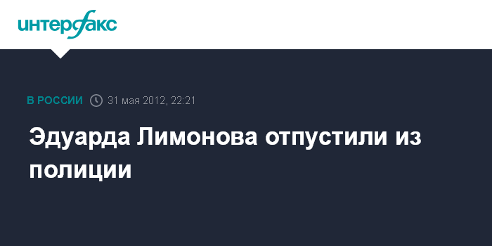 Москва. 31 мая. INTERFAX.RU - Оппозиционер и писатель, лидер незарегистрированной партии "Другая Россия" Эдуард Лимонов отпущен из полиции после задержания на несогласованной с властями акции на Триумфальной площади.