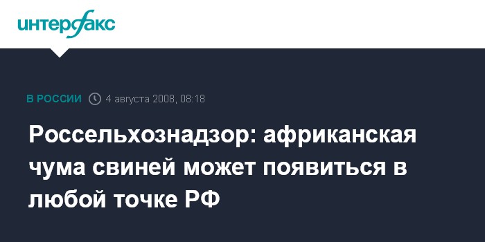 Москва. 4 августа. INTERFAX.RU - Африканская чума свиней может появиться в любом регионе России, считает заместитель руководителя Россельхознадзора, главный Государственный ветеринарный инспектор РФ Николай Власов. "Угроза распространения этого опасного заболевания в тысячу раз серьезнее, чем грипп птиц", - заявил он журналистам.