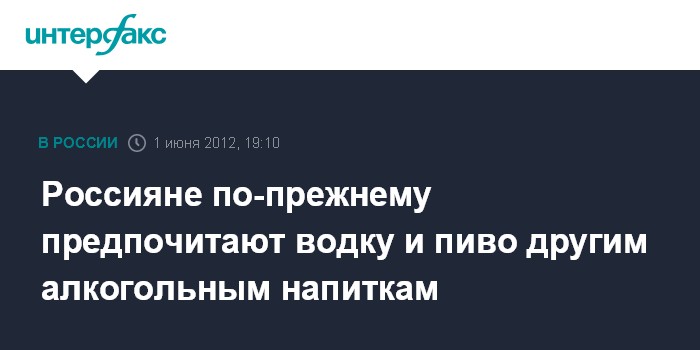 Москва. 1 июня. INTERFAX.RU - Россияне по-прежнему предпочитают водку и пиво другим алкогольным напиткам. Причем, как сообщил Росстат в пятницу, в январе-апреле доля водки и ликероводочных изделий в объеме проданного алкоголя увеличилась, пива - снизилась.