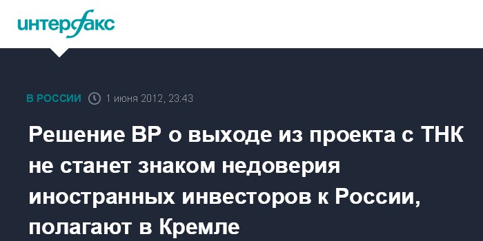 Париж. 1 июня. ИНТЕРФАКС - В Кремле не считают, что выход компании BP из совместного проекта с ТНК станет плохим сигналом для иностранных инвесторов.