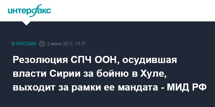 Как сообщалось, 1 июня в Женеве по инициативе группы западных стран была созвана очередная специальная сессия Совета ООН по правам человека в связи с недавними трагическими событиями в сирийском городе Хула. По ее итогам была принята резолюция, осуждающая исключительно правительство Сирии за произошедшее.