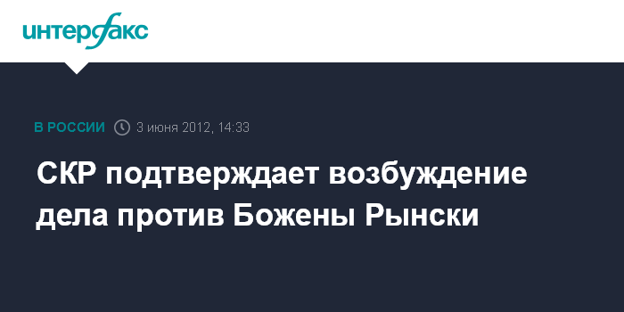 Москва. 3 июня. INTERFAX.RU - Следственный комитет РФ по городу Москве возбудил в отношении журналистки Божены Рынски уголовное дело по ст. 319 УК РФ (оскорбление представителя власти), сообщает в воскресенье сайт СК РФ. "По данным следствия, 6 декабря 2011 года на несогласованной акции на Триумфальной площади во время задержания Рынска публично оскорбила полицейского, после чего она продолжила высказывать нецензурные слова в адрес сотрудника и в самом ОВД, в которое ее доставили в тот же день", - отмечается в сообщении СК РФ.