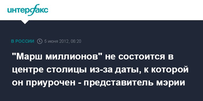 "Все дело заключается в дате, 12 июня, на которую запланировано много других событий: культурных программ, спортивных и т.д. Во второй половине 12-го числа люди будут возвращаться из-за города после трех выходных дней, и мы должны учитывать то, что людям надо нормально доехать до своих домов", - сказал А.Майоров в интервью, которое публикуют "Известия" во вторник.