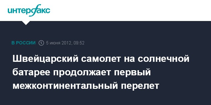 Берн. 5 июня. INTERFAX.RU - Швейцарский самолет, работающий за счет солнечной энергии, летит из Мадрида в Рабат, продолжая свой первый в мире межконтинентальный перелет, не используя ни единой капли топлива, сообщили журналистам в понедельник сотрудники компании-производителя "Солар импалс".