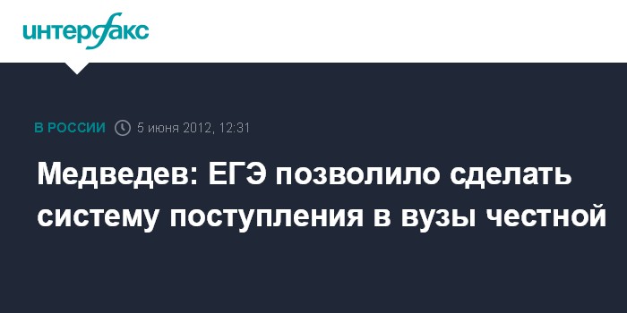 "Но уже сейчас ясно, что введение этой системы сделало поступление в вузы более открытым и честным. Выпускники в отдаленных районах страны получили возможность поступать в самые престижные вузы",- сказал Медведев, открывая селекторное совещание по вопросу об итогах учебного года.