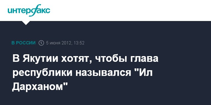 Москва. 5 июня. INTERFAX.RU - В Якутии собираются внести изменения в Конституцию республики с тем, чтобы исключить наименование "президент" для высшего должностного лица региона, а вместо него ввести два термина на русском и якутском языках - "Глава Якутии" и "Ил Дархан" (народный правитель - якут.).