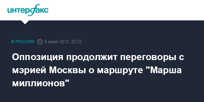 Москва. 5 июня. INTERFAX.RU - Столичные власти пока не договорились с оппозицией о месте проведения "Марша миллионов" 12 июня в Москве, сообщил лидер "Левого фронта" Сергей Удальцов.
