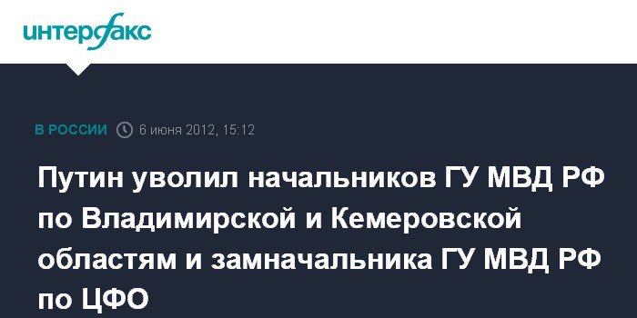 Путин уволил начальников ГУ МВД РФ по Владимирской и Кемеровской областям и замначальника ГУ МВД РФ по ЦФО