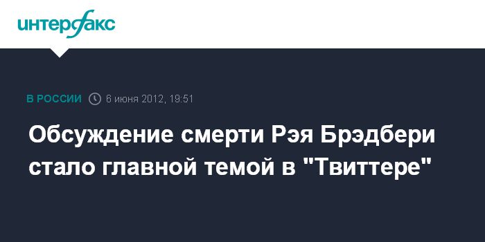 Москва. 6 июня. INTERFAX.RU – Кончина американского фантаста стала в среду вечером главной темой записей русскоязычного сегмента "Твиттера", а также вошла в пятерку мировых тем.
