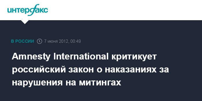 Москва. 7 июня. ИНТЕРФАКС - Одна из ведущих международных правозащитных организаций Amnesty International подвергла критике одобренный российским парламентом закон, ужесточающий санкции за нарушения на митингах, и считает, что он подавляет свободу собраний.