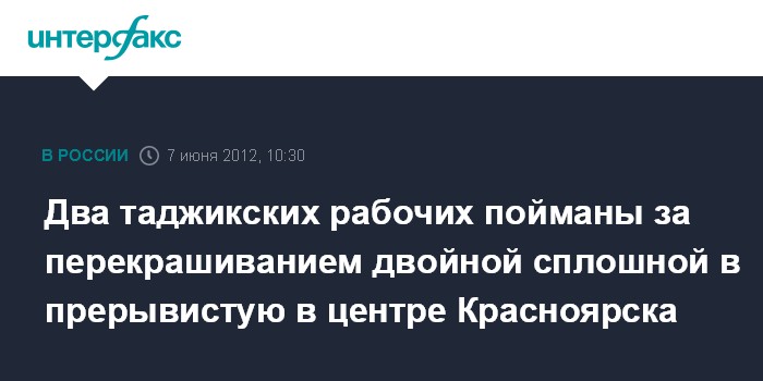 Красноярск. 7 июня. INTERFAX.RU - Красноярские полицейские задержали двух граждан Таджикистана, которые закрашивали дорожную разметку на одной из главных улиц краевого центра, сообщил агентству "Интерфакс-Сибирь" заместитель начальника пресс-службы ГУВД по Красноярскому краю Владимир Юрченко.