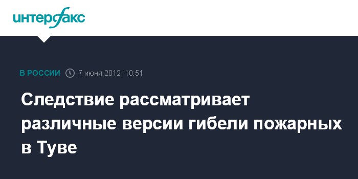 Кызыл. 7 июня. INTERFAX.RU - Следствие рассматривает несколько версий гибели пожарных в Туве, в том числе нарушение правил безопасности при тушении пожара, сообщила агентству "Интерфакс-Сибирь" старший помощник руководителя СУ СКР по Туве Алла Нурсат.